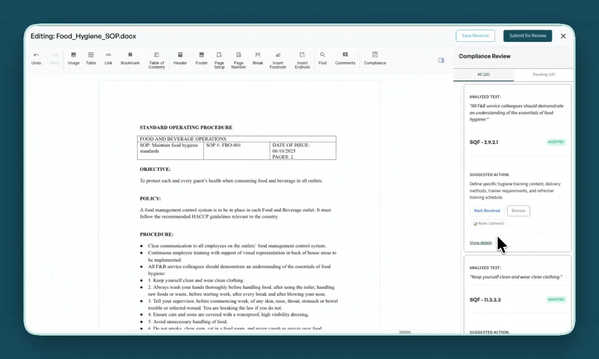 Ensure your SOPs are always accurate, compliant, and audit-ready. Track revisions, manage approvals, and implement AI-powered suggestions to strengthen your documentation process.