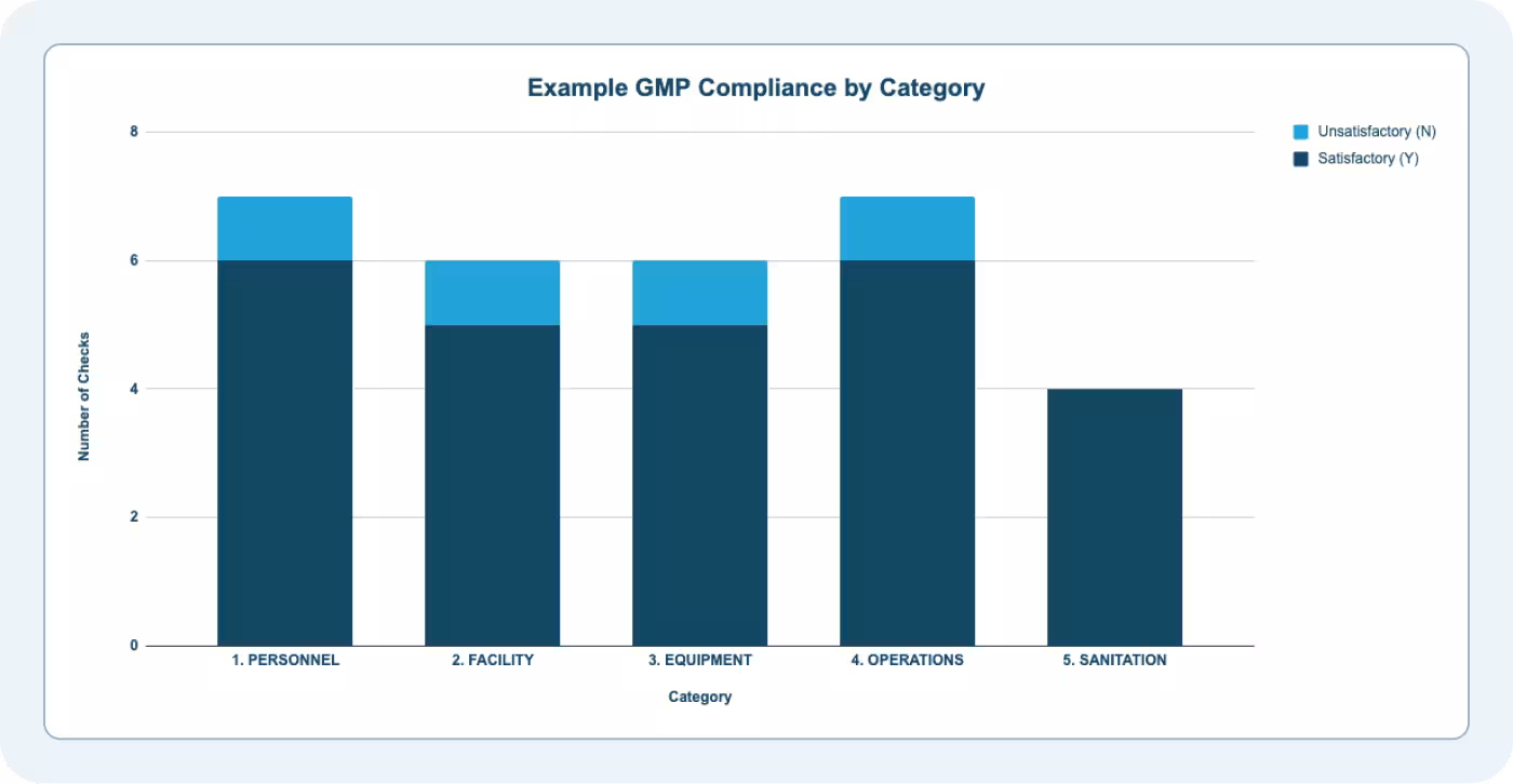 This GMP audit checklist gives you a floor-level verification structure built for food manufacturers like you, with inspection items organized across five critical categories, action tracking that separates immediate corrections from systemic CAPAs, and a dashboard that shows compliance patterns by category.