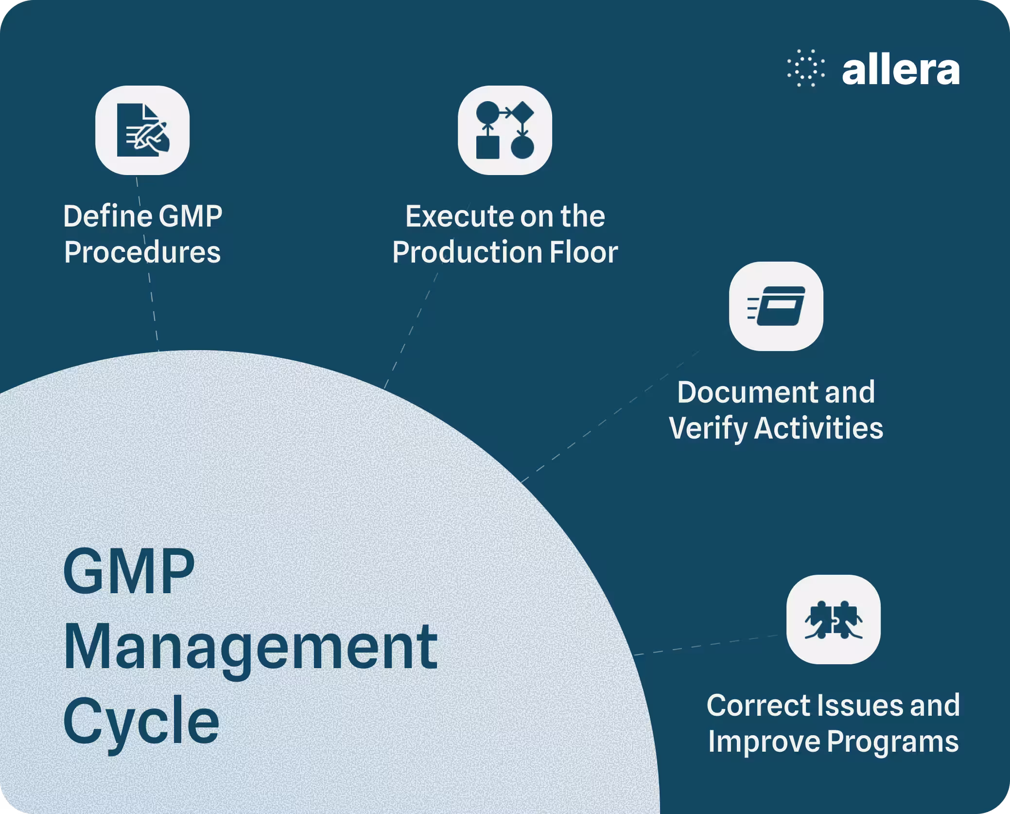 This management cycle applies across all areas of GMP, from personnel practices and facility conditions to process controls and documentation.