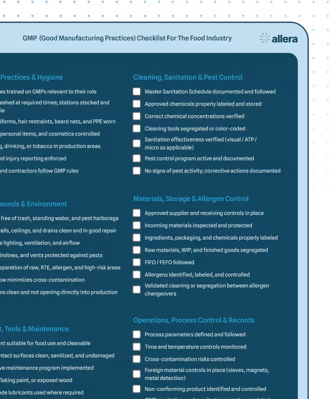 - Allera helps food manufacturers centralize GMP, automate workflows, and turn compliance into a strategic advantage.