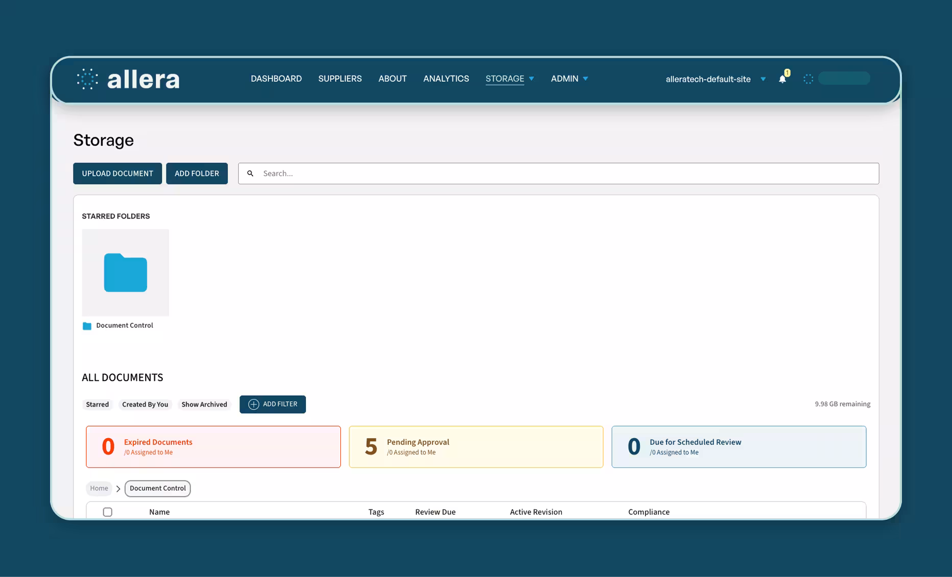 Allera streamlines supplier management with dynamic onboarding, automated reminders, and centralized documentation. Suppliers can upload certifications and records directly into the system—or even respond to an email—and everything is automatically organized. This eliminates the back-and-forth emails that slow down compliance and ensures you always know who’s up to date and who isn’t.